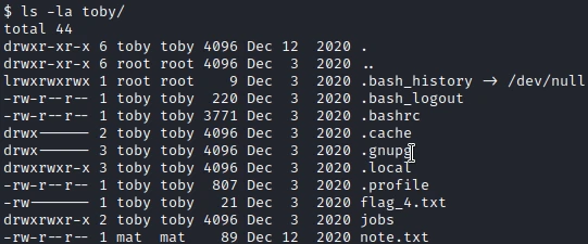 Using the same command as above I find that the fourth flag is in the user toby folder. So I will have to find a way to change the user.