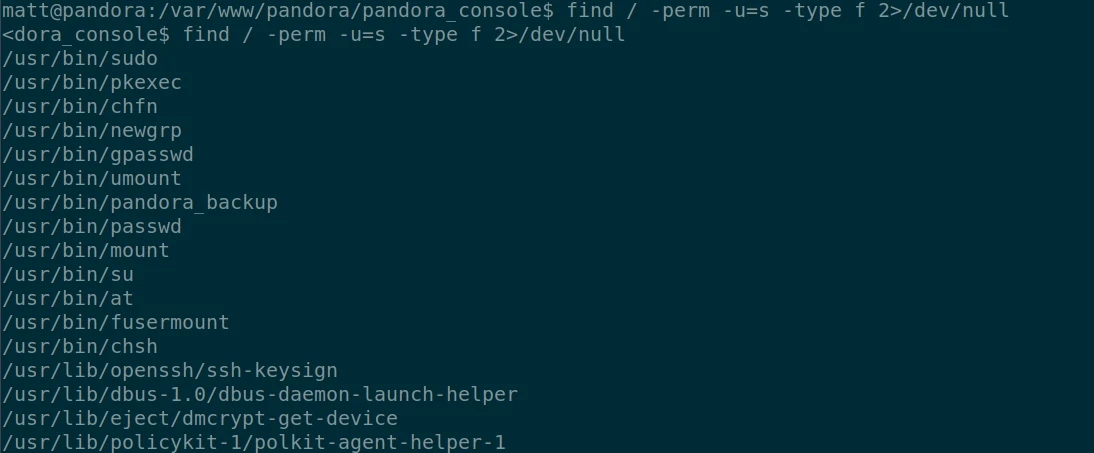 I will now be able to use the sudo command, but I don't have matt's password, I have to find another lever to get root. A second command that seemed interesting was: "pandora_backup". Indeed a custom script and therefore with potential flaws. After downloading it locally, I extract the strings to try to see if I can recover some information from the :