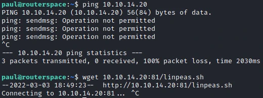 To start I'll use linPeas to do a first exploit tracking on the machine. But I have indeed the impression that IPtables rules are blocking my requests: