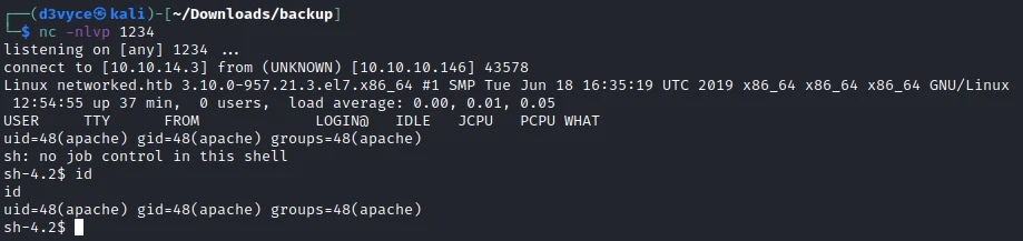 I now have a reverse shell as apache. But I don't have the access to see the first flag. In the user's home folder, I notice 2 interesting files: