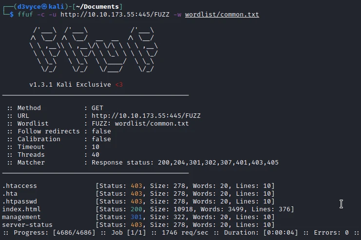 I start by listing the directories of the site hosted on port 445: