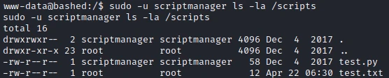 So he has the authorization to execute any command as scriptmanager. So I search for files/scripts on the machine and find the /scripts. I check the permissions with the following command: