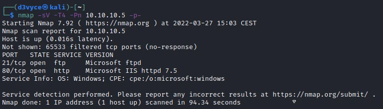 nmap -sV -T4 -Pn 10.10.10.5