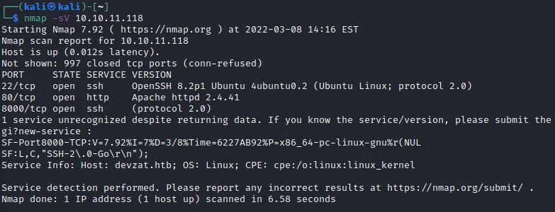 • 22/tcp : SSH port (OpenSSH 8.2p1)