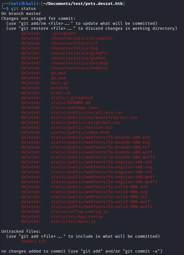 And indeed a large number of files have been deleted, so I will restore the last commit with the following command:
