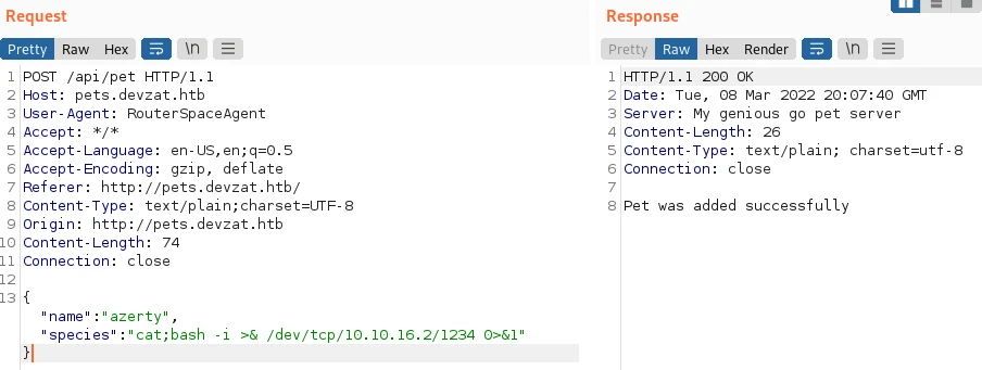 Then I modify the value of "species" to insert my code. I test at first a classical reverse shell, but without success.