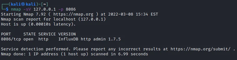 I can then perform an nmap scan on my local address to identify the service running on port 8086.