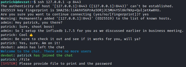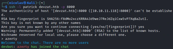 In the linPeas scan result I also noticed that a "devchat" service was running with patrick rights. It looks like a test version running on port 8443 in parallel with the production version.