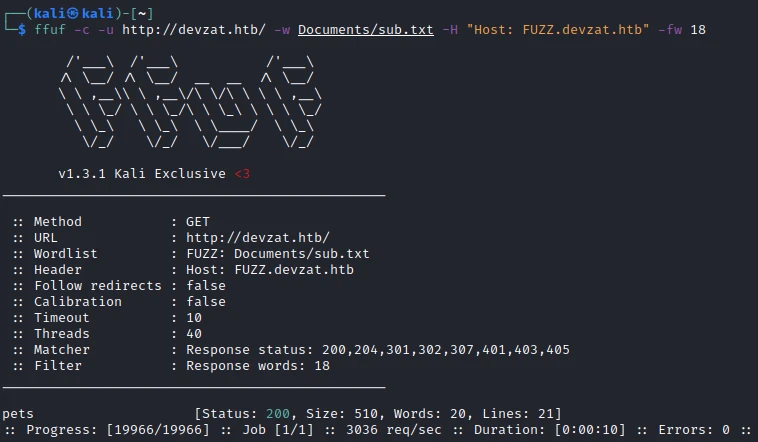 ffuf -c -u http://devzat.htb -w Documents/sub.txt -H "Host: FUZZ.devzat.htb" -fw 18