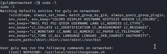 I have the right to run the changename.sh script as root. Looking at the code of the script, I determine that it allows to change the name of a network interface.