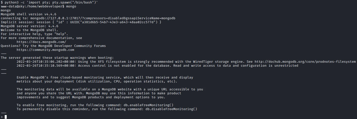 I start by running linPeas. In the result of the command I find that Mysql and MangoDB are running on the machine...