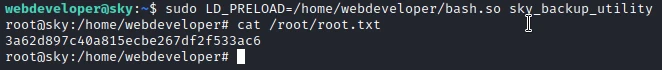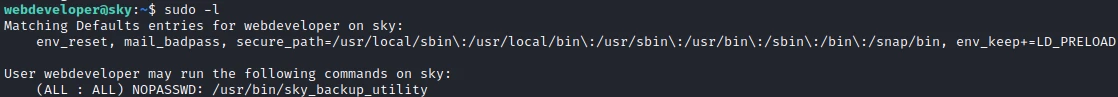The webdeveloper user can execute the sky_backup_utility with root rights. But the most interesting thing is the tag: env_keep+=LD_PRELOAD.