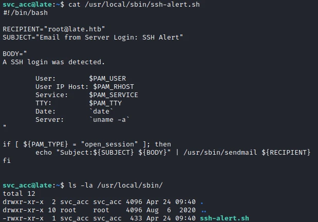 To start I run the linpeas.sh script to get an idea of what is present on the machine. Quickly I find a script ssh-alert.sh which is a script belonging to my user, but which is executed by root.