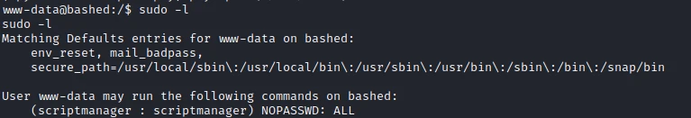 So he has the authorization to execute any command as scriptmanager. So I search for files/scripts on the machine and find the /scripts. I check the permissions with the following command: