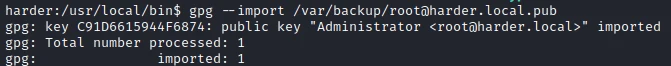 echo "[-] This program runs only commands which are encypted for root@harder.local using gpg."