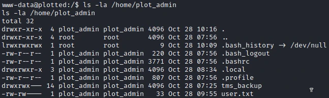 I now have a reverse shell with the user plot_admin and I can get the first flag.