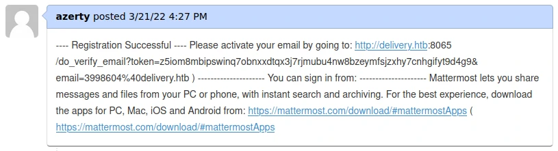 | 7z9izpo1wfrnddytkm8815wg4w | 1647894531289 | 1647894703010 | 0 | azerty | $2a$10$Dwc/LdQGFD0PdJrmLwD07uTbZE1CfpswRJCMsoGKeJHKtn4/LIPW. | NULL | | 3998604@delivery.htb | 1 | | | | | system_user | 1 | {} | {"channel":"true","comments":"never","desktop":"mention","desktop_sound":"true","email":"true","first_name":"false","mention_keys":"","push":"mention","push_status":"away"} | 1647894531289 | 0 | 0 | en | {"automaticTimezone":"America/New_York","manualTimezone":"","useAutomaticTimezone":"true"} | 0 | |