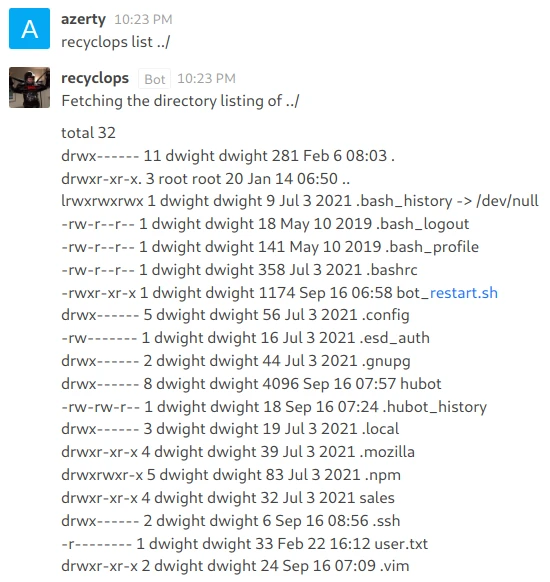 My account gives me access to several elements and in particular has a conversation with the various employees of the company. In this discussion we learn that dwight has created a bot that can interact with files. I start a private conversation with this bot and test some commands: