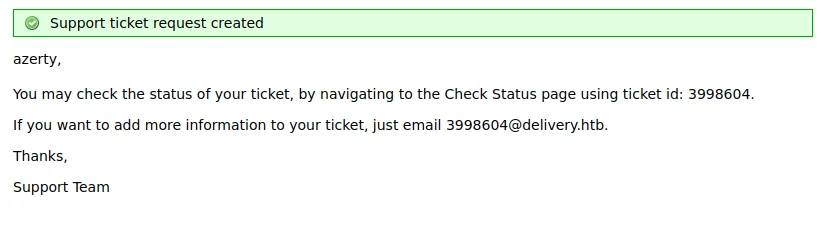 I try to create an account, but the site asks me to validate the account via email. I first try to use a temporary email, but I get no confirmation. Then I notice that when I create a helpdesk ticket, it is indicated that I can send emails to the address 3998604@delivery.htb to add additional information to the ticket. So I use this address when creating the account and when validating I go back to the ticket site and find the following message: