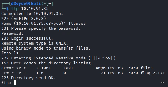 We learn that the credentials of the FTP server are: ftpuser:givemefiles777. So I can connect and list the files: