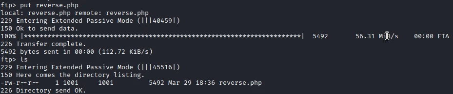 In addition to the reading rights, the FTP access allows me to send files. So I create a PHP reverse shell, then I upload it on the server.