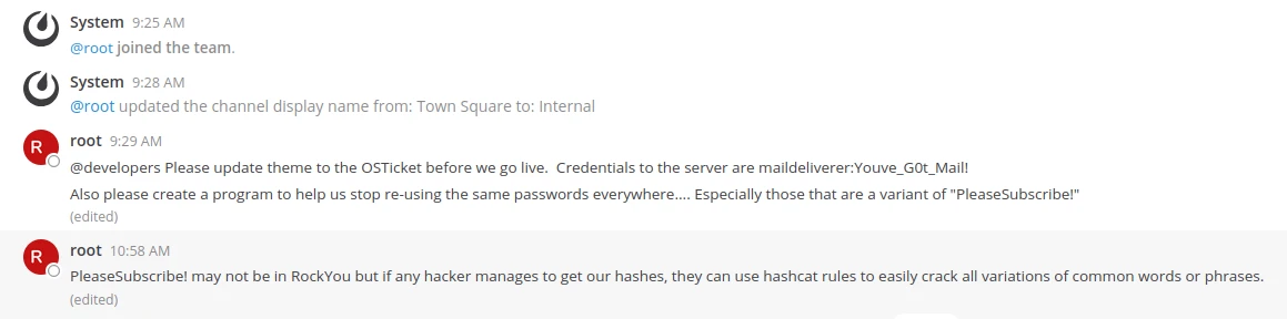 | hatotzdacb8mbe95hm4ei8i7ny | 1609844805777 | 1609844805777 | 0 | ff0a21fc6fc2488195e16ea854c963ee | $2a$10$RnJsISTLc9W3iUcUggl1KOG9vqADED24CQcQ8zvUm1Ir9pxS.Pduq | NULL | | 9122359@delivery.htb | 0 | | | | | system_user | 0 | {} | {"channel":"true","comments":"never","desktop":"mention","desktop_sound":"true","email":"true","first_name":"false","mention_keys":"","push":"mention","push_status":"away"} | 1609844805777 | 0 | 0 | en | {"automaticTimezone":"","manualTimezone":"","useAutomaticTimezone":"true"} | 0 | |