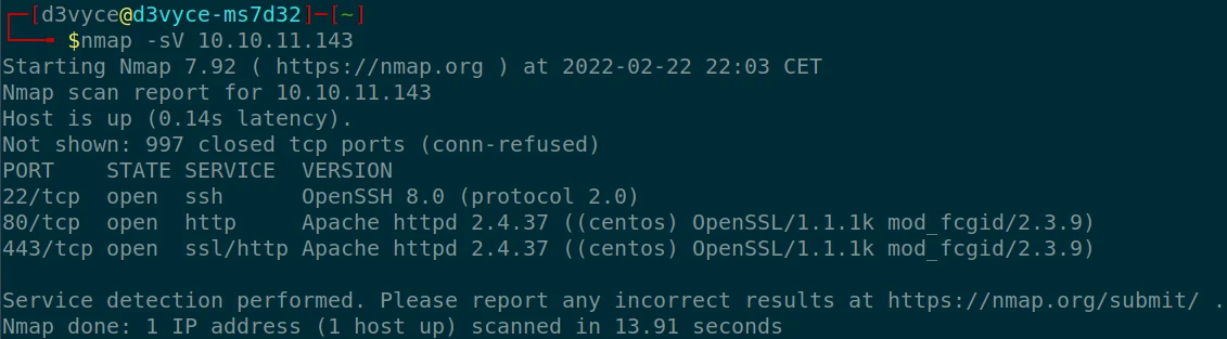 - 80/tcp : HTTP web server (Apache 2.4.37)