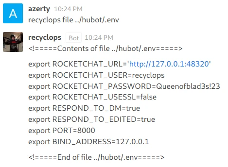 My account gives me access to several elements and in particular has a conversation with the various employees of the company. In this discussion we learn that dwight has created a bot that can interact with files. I start a private conversation with this bot and test some commands: