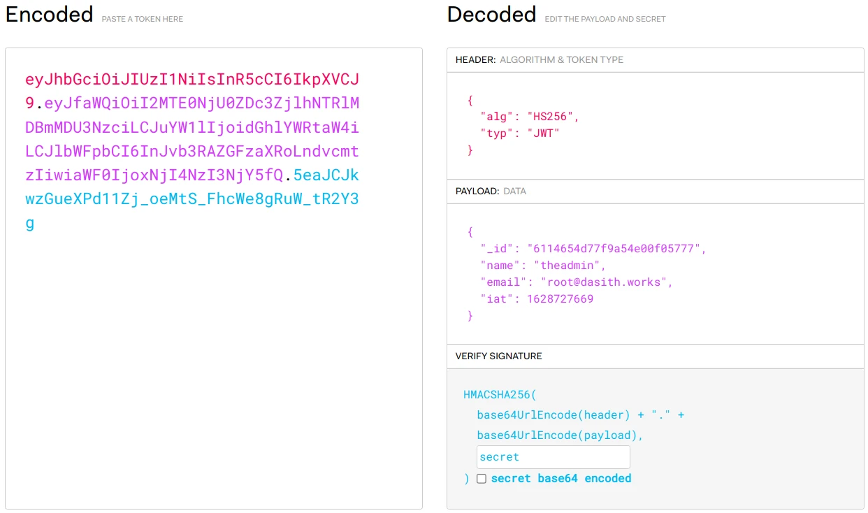 eyJhbGciOiJIUzI1NiIsInR5cCI6IkpXVCJ9.eyJfaWQiOiI2MTE0NjU0ZDc3ZjlhNTRlMDBmMDU3NzciLCJuYW1lIjoidGhlYWRtaW4iLCJlbWFpbCI6InJvb3RAZGFzaXRoLndvcmtzIiwiaWF0IjoxNjI4NzI3NjY5fQ.52W5mGLsIO2iiLpy3f1VkVavP4hOoWHxy5_0BDn9UKo