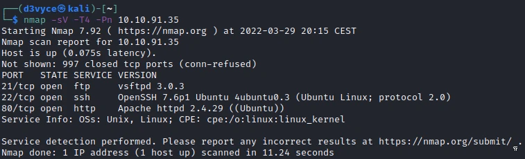 - 21/tcp : FTP (vsftpd 3.0.3)