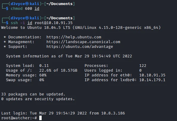 This is an id_rsa! Certainly the one of the root user. So I add the permissions to the file, then I launch an SSH session: