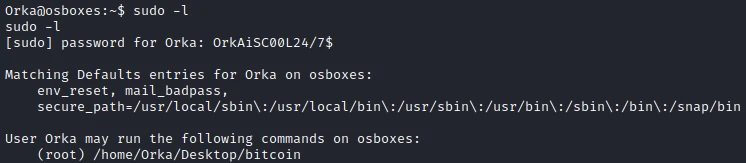 I start by checking the user's authorization. Interestingly, my user has the right to run the bitcoin script with root rights.